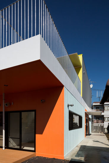 老朽化した園舎を取壊し、新園舎を建設するプロジェクト。敷地において東西に長く建物を配置し、南側に対して広く開放的な建物の構成としている。年齢の小さな子どもがスムースに園庭に出られるように、園庭に面する保育室には、0-2歳児の保育室、2階には3-5歳児の保育室を配置している。限られた敷地であるため、2階にはとても大きなテラスを設け、夏にはプールを設置できる第二の園庭として計画し、2階の保育室も外部への空間的な連続性を確保し、子どもたちの自由な活動の妨げにならないような空間をめざした。また2階の保育室は、可動間仕切りを開け放すことで、入園式や卒園式など行事を行うためのホールとしても多目的に活用できるようになっている。